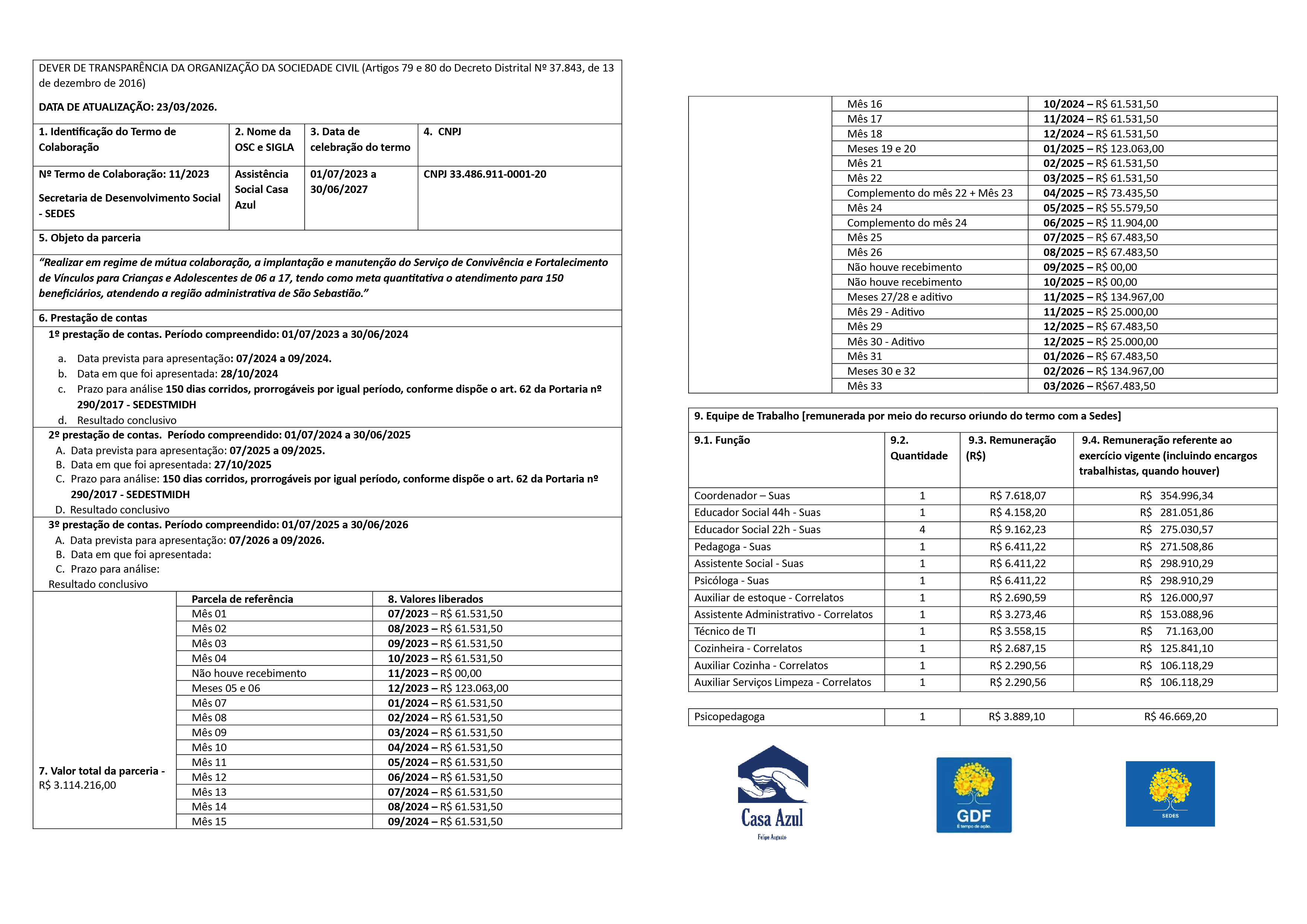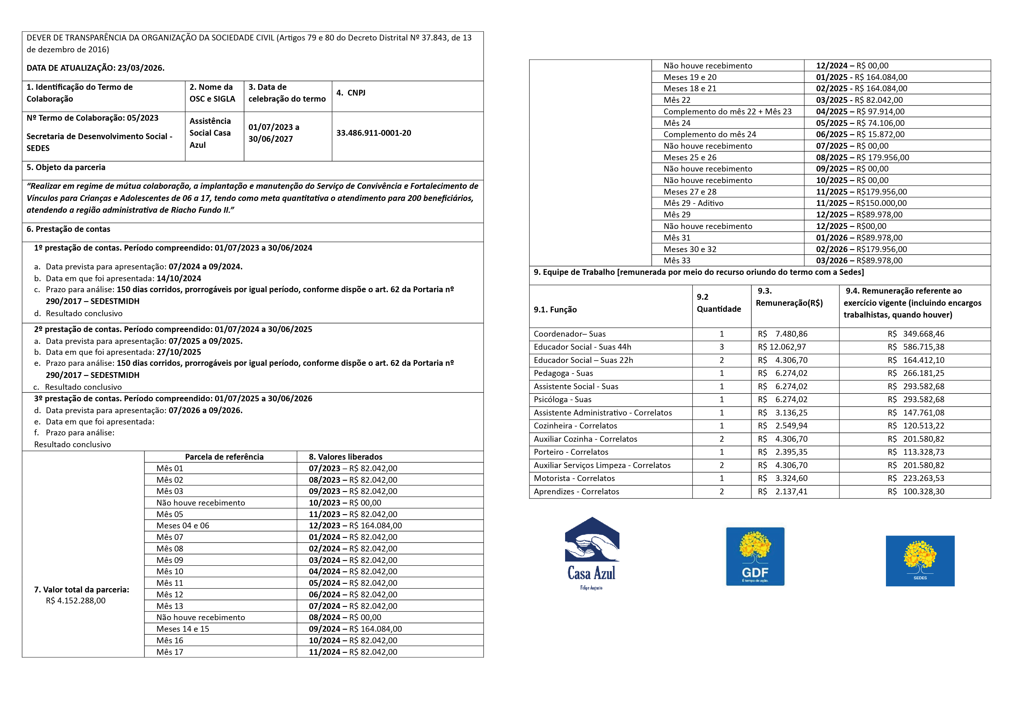 Sedes DFTermo de Colaboração nº 04/2023 – SAMAMBAIA - SEDESTermo de Colaboração nº 05/2023 – RIACHO FUNDO II - SEDESTermo de Fomento nº 06/2023 – RIACHO FUNDO II - SEDESTermo de Colaboração nº 11/2023 – AABB (SÃO SEBASTIÃO) - SEDES